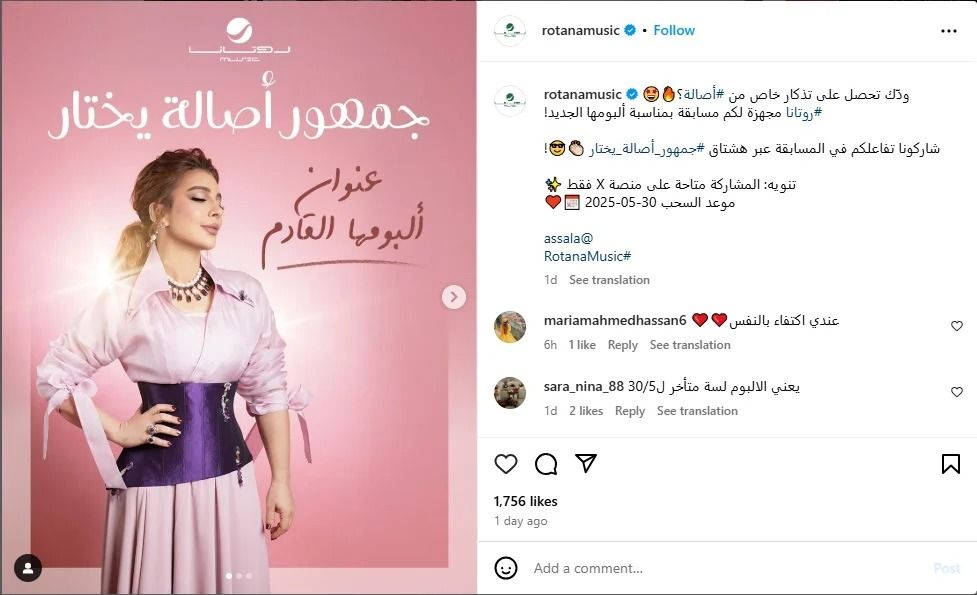 نشرت الصفحة الرسمية لشركة روتانا للصوتيات والمرئيات على "إنستغرام"، البوستر المبدئي لألبوم الفنانة السورية أصالة نصري تطلب فيه من جمهورها مساعدتها في اختيار اسم ألبومها المصري الجديد، المقرر طرحه خلال الأسابيع القليلة المقبلة، بعد أن شارفت على الانتهاء من تسجيل أغنياته، بالتعاون مع شركة روتانا.