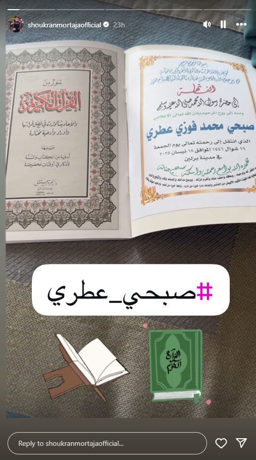 وفي التفاصيل، نشرت شكران مقطع فيديو يظهر القران الكريم مع صفحة كُتب عليها اسم صبحي عطري، وقالت في الفيديو إنها تقدم حسنة جارية عن روح صبحي عطري.