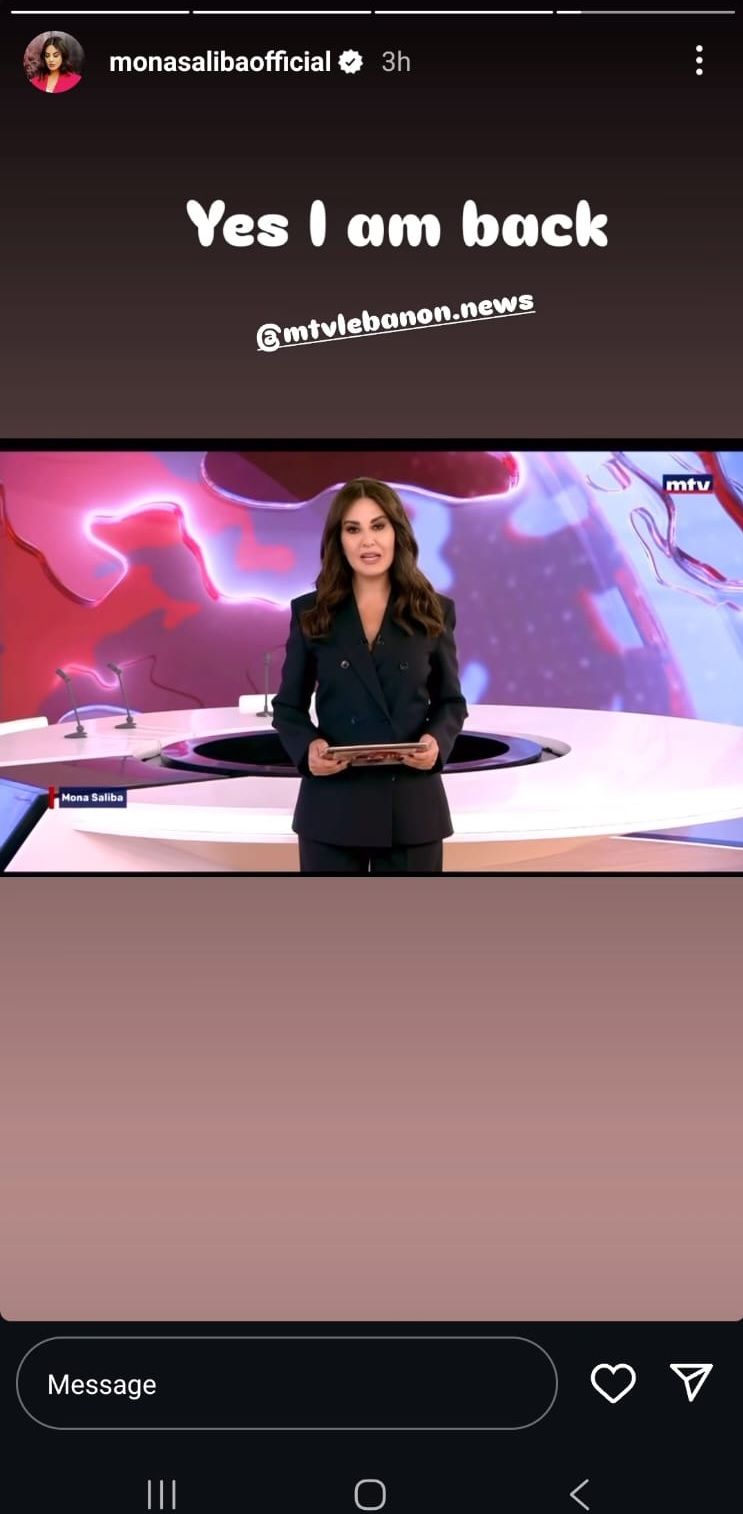 Advertisement وعلّقت صليبا على عودتها إلى الـ"أم تي في" بالقول: "نعم لقد عدت". وتجدر الإشارة إلى أنّ منى تركت القناة قبل أكثر من 3 سنوات، وانتقلت إلى "الحرة".