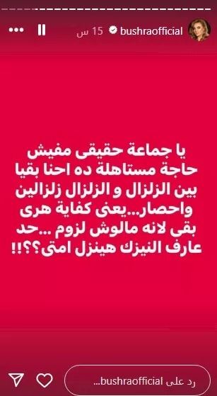 وكتبت بشرى على صفحتها الشخصية في موقع إنستجرام: "ياجماعة حقيقي مفيش حاجة مستاهلة دة احنا بقينا بين الزلزال والزلزال زلزالين واعصار، يعني كفاية هري بقي لأنه ملهوش لزوم، حد عارف النيزك هينزل امتى".وأصدر المعهد القومي للبحوث الفلكية والجيوفيزيقية بيانًا حول وقوع هزة أرضية اليوم الثلاثاء، حيث سجلت محطات الشبكة القومية لرصد الزلازل التابعة للمعهد هزة أرضية بقوة 5.8 درجة على مقياس ريختر.