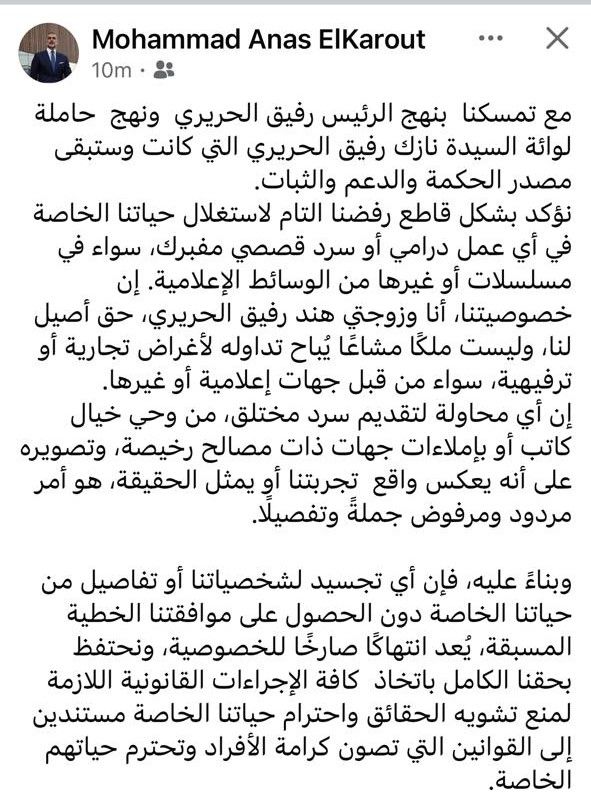 وختم: "بناء عليه، فإن أي تجسيد لشخصياتنا أو تفاصيل من حياتنا الخاصة دون الحصول على موافقتنا الخطية المسبقة، يُعد انتهاكًا صارخًا للخصوصية، ونحتفظ بحقنا الكامل باتخاذ كافة الإجراءات القانونية اللازمة لمنع تشويه الحقائق واحترام حياتنا الخاصة مستندين إلى القوانين التي تصون كرامة الأفراد وتحترم حياتهم الخاصة.