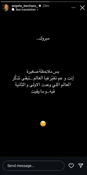 وعلقت أنجيلا بستوري عبر حسابها على "إنستغرام": "مبروك.. بس ملاحظة صغيرة، إنت وعم تغير فيا العالم.. تبقى تذكر العالم الأولى والتانية باللي وعدت فيه.. وما وفيت".