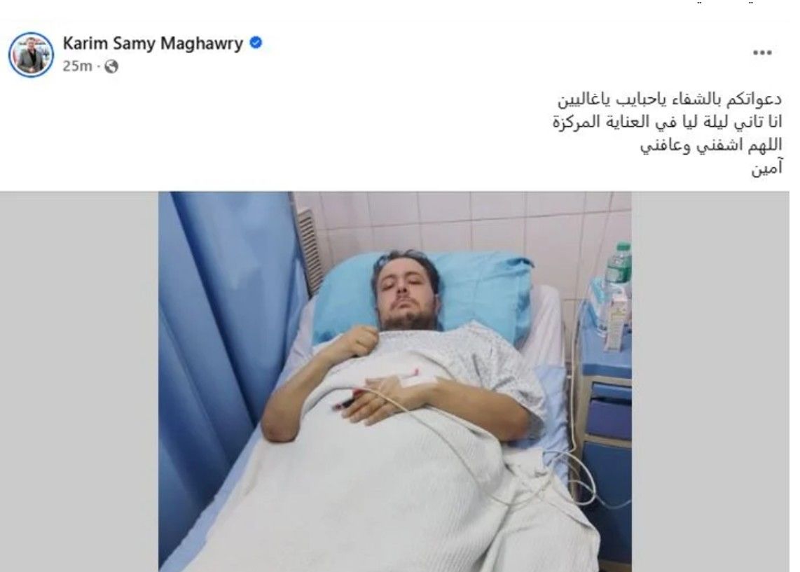 ونشر كريم، صورة له من داخل غرفة العناية المركزة بأحد المستشفيات عبر حسابه على "فيسبوك"، وعلق عليها قائلًا: دعواتكم بالشفاء، أنا تاني ليلة ليّا في العناية المركزة اللهم اشفني وعافني".