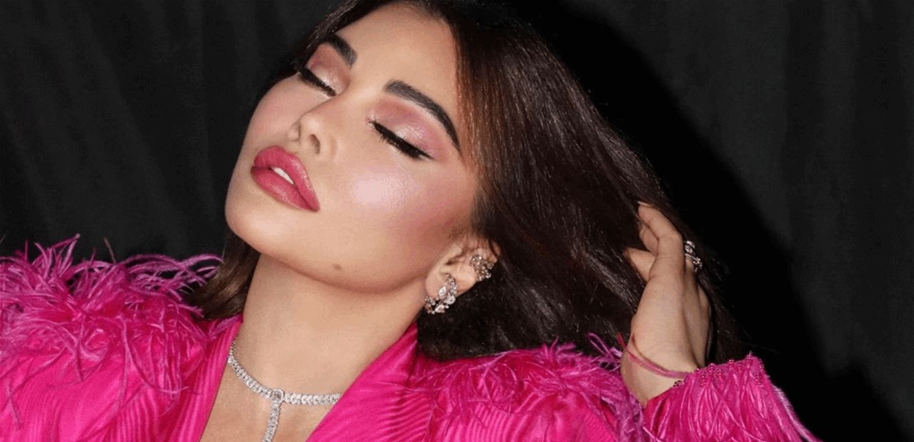 الإطلالة الأولى جاءت على شكل جمبسوت بلون التوت الوردي، مرصّع بالترتر والزخارف اللامعة، ومزيّن بكاب من الريش ينسدل على الكتف ليمنحها مزيجاً من الدراما والحداثة.