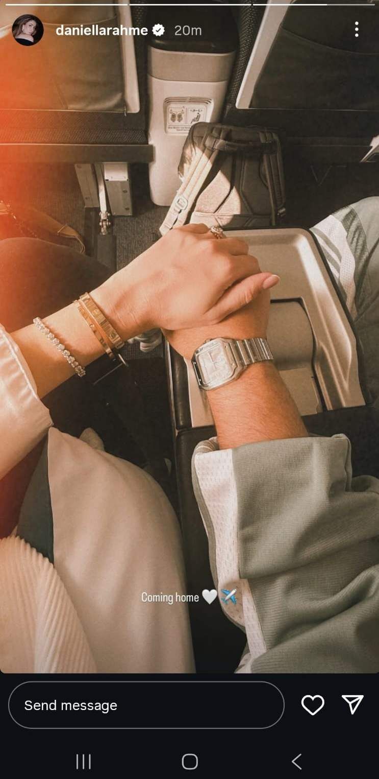 نشرت الممثلة دانييلا رحمة صورة من داخل الطائرة، وهي تُمسك بيدّ زوجها الفنان السوريّ ناصيف زيتون. Advertisement وعلّقت رحمة على الصورة بالقول: "ذاهبون إلى بلدنا".