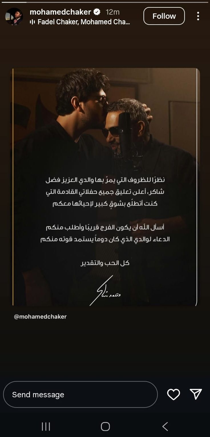 قال الفنان محمد شاكر: "نظراً للظروف التي يمرّ بها والدي فضل شاكر، أعلن تعليق كافة حفلاتي المقبلة التي كنت أتطلع بشوقٍ كبير لإحيائها معكم".