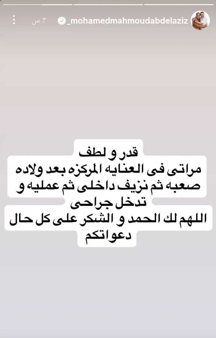 وعاد محمد محمود عبد العزيز لينشر منشوراً آخر كشف فيه عن تطورات الحالة الصحية لزوجته، وطمأن خلاله متابعيه قائلاً: "اللهم لك الحمد والشكر، طلعوا سارة من العناية المركزة لغرفة عادية، وهتكون تحت الملاحظة لمدة 48 ساعة".