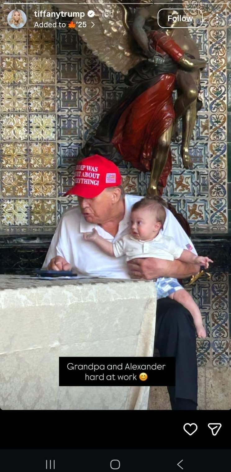نشرت تيفاني إبنة الرئيس الأميركيّ دونالد ترامب، صوراً عبر خاصية "ستوري" عبر حسابها على "انستغرام"، لوالدها وهو يحمل حفيده ألكسندر.