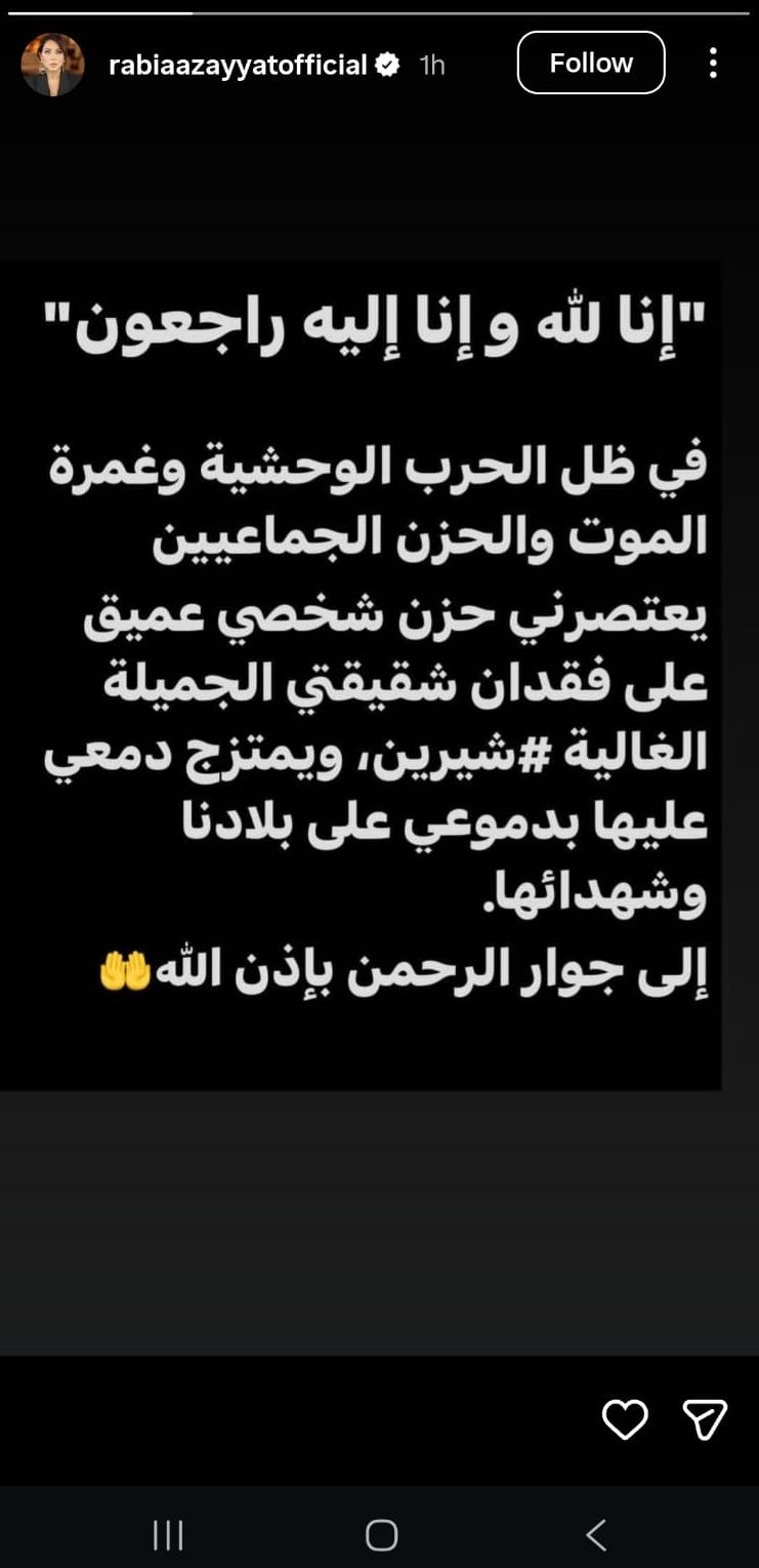 "في ظل الحرب الوحشية وغمرة الموت والحزن الجماعيين، يعتصرني حزن شخصي عميق على فقدان شقيقتي الجميلة الغالية شيرين".