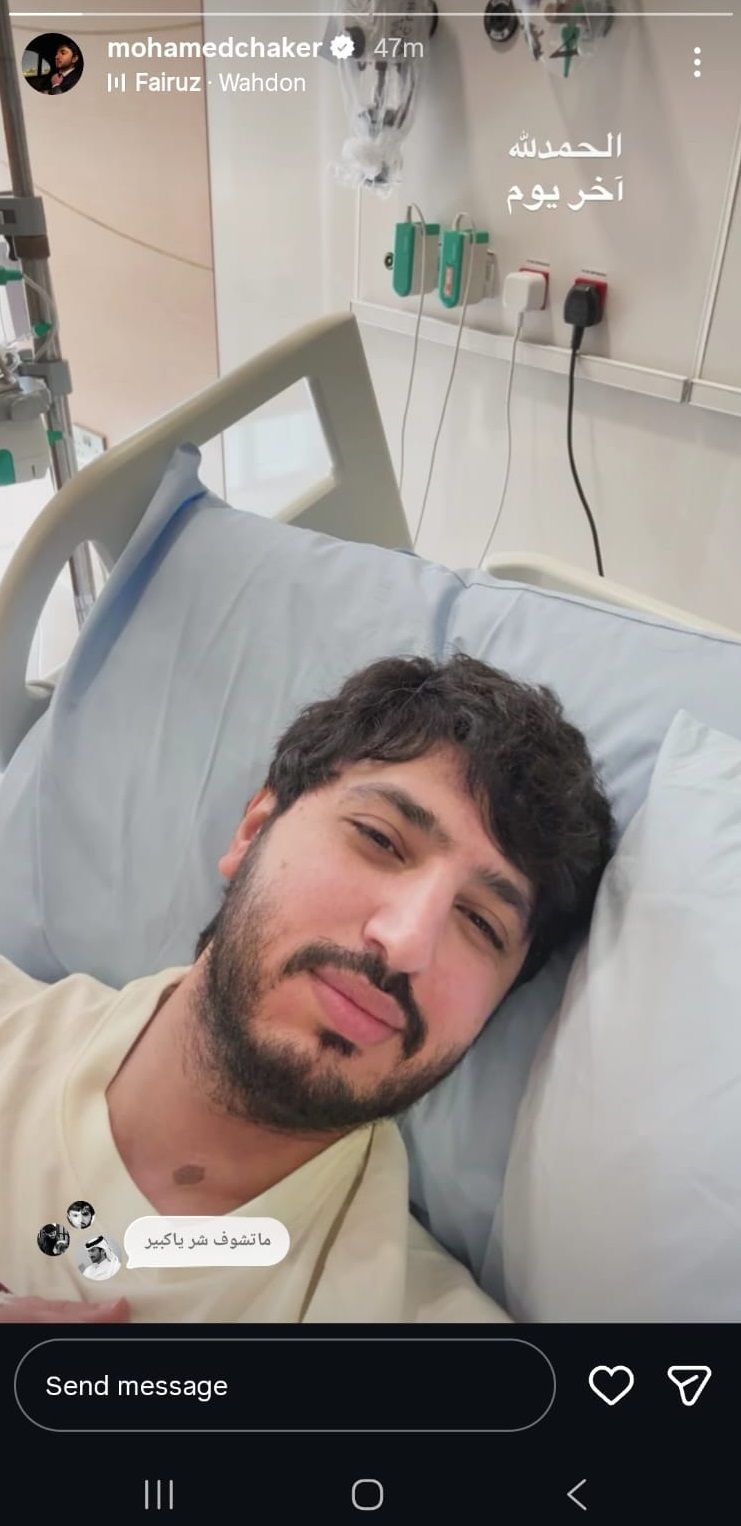 وقال شاكر تعليقاً على صورته من داخل المستشفى: "الحمدلله آخر يوم".