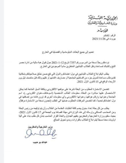 نشر وزير الخارجية عبدالله بو حبيب تعميم يطلب فيه من البعثات الدبلوماسية والقنصلية في الخارج ابلاغ الطلاب اللبنانيين بإمكانية تقديم طلب مساعدة لتمويل جزء من أقساطهم الجامعية أو مصاريف إقامتهم وذلك قبل منتصف ليل الأربعاء الواقع في 15 كانون الأول 2021.