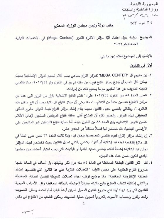 قدمت وزارة الداخلية والبلديات دراسة حول اعتماد آلية مراكز الاقتراع الكبرى (Mega Centers) في الانتخابات النيابية للعام 2022، وشملت هذه الدراسة النواحي القانونية، الاجرائية واللوجستية، والموارد البشرية المطلوبة،