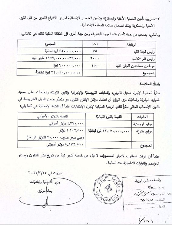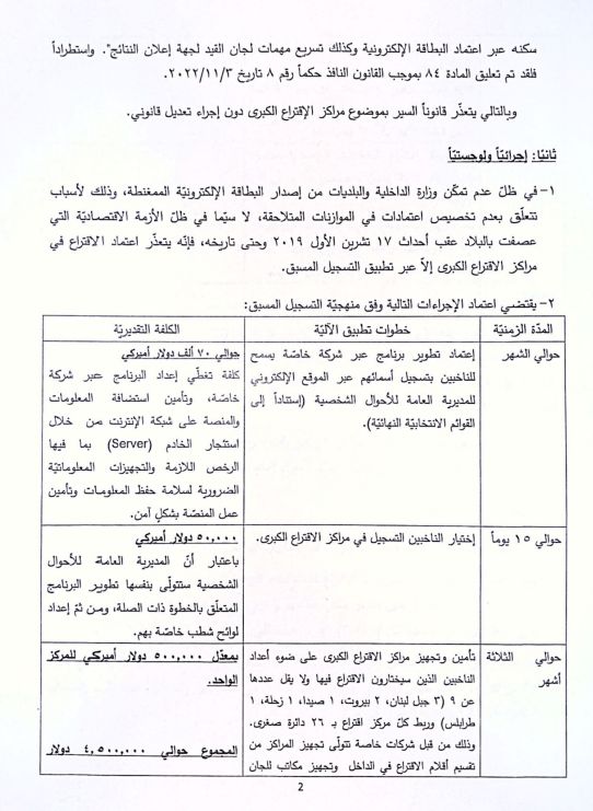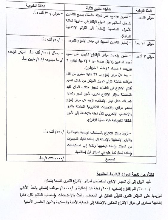 وأشارت الوزارة إلى أن “الدراسة التي طلبها رئيس الحكومة نجيب ميقاتي من الوزارة بعد رسالة من رئيس الجمهورية ميشال عون، خلُصت إلى أنه يتعذّر اعتماد مراكز الاقتراع الكبرى ضمن المهل المفروضة في قانون الانتخاب الحالي في ظل الحاجة لاجراء تعديلات قانونية، إضافة إلى العقبات اللوجستية والاجرائية، والحاجات على صعيد الموارد البشرية والمادية”، لافتة إلى أن “الوقت المطلوب لانجاز التحضيرات لا يقلّ عن خمسة أشهر تبدأ من تاريخ نشر القانون وإصدار المراسيم التطبيقية عند الحاجة، وأنّ الكلفة الاجمالية للمشروع تبلغ حوالي 5،872،500 دولار أميركي”.