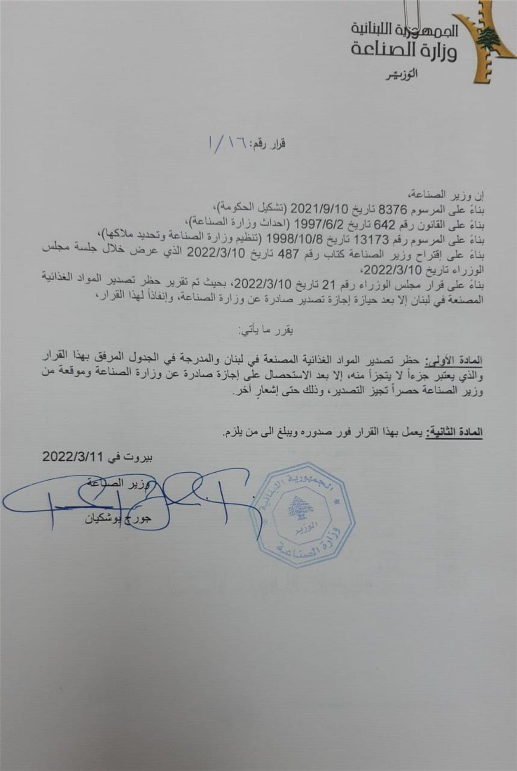 أعلنت وزارة الصناعة حظر تصدير عدد من المواد الغذائية المصنعة في لبنان، إلا بعد الاستحصال على إجازة صادرة عن وزارة الصناعة وموقّعة من وزير الصناعة حصراً تجيز التصدير، وذلك حتى إشعار آخر.