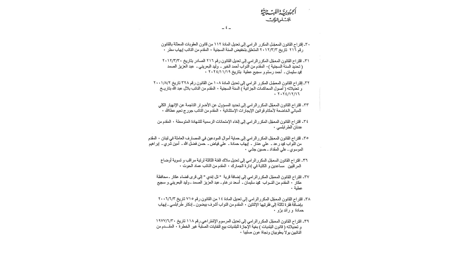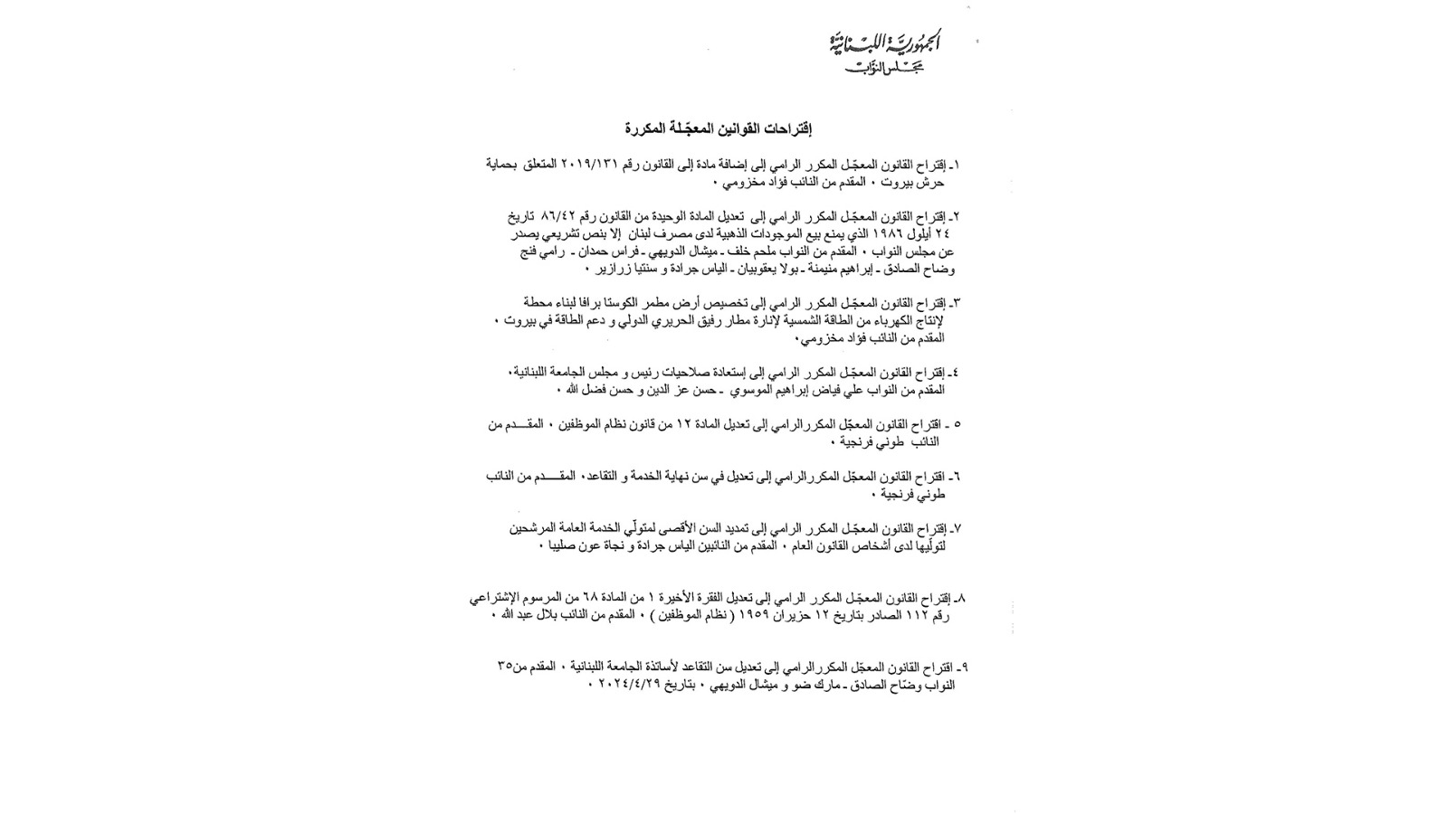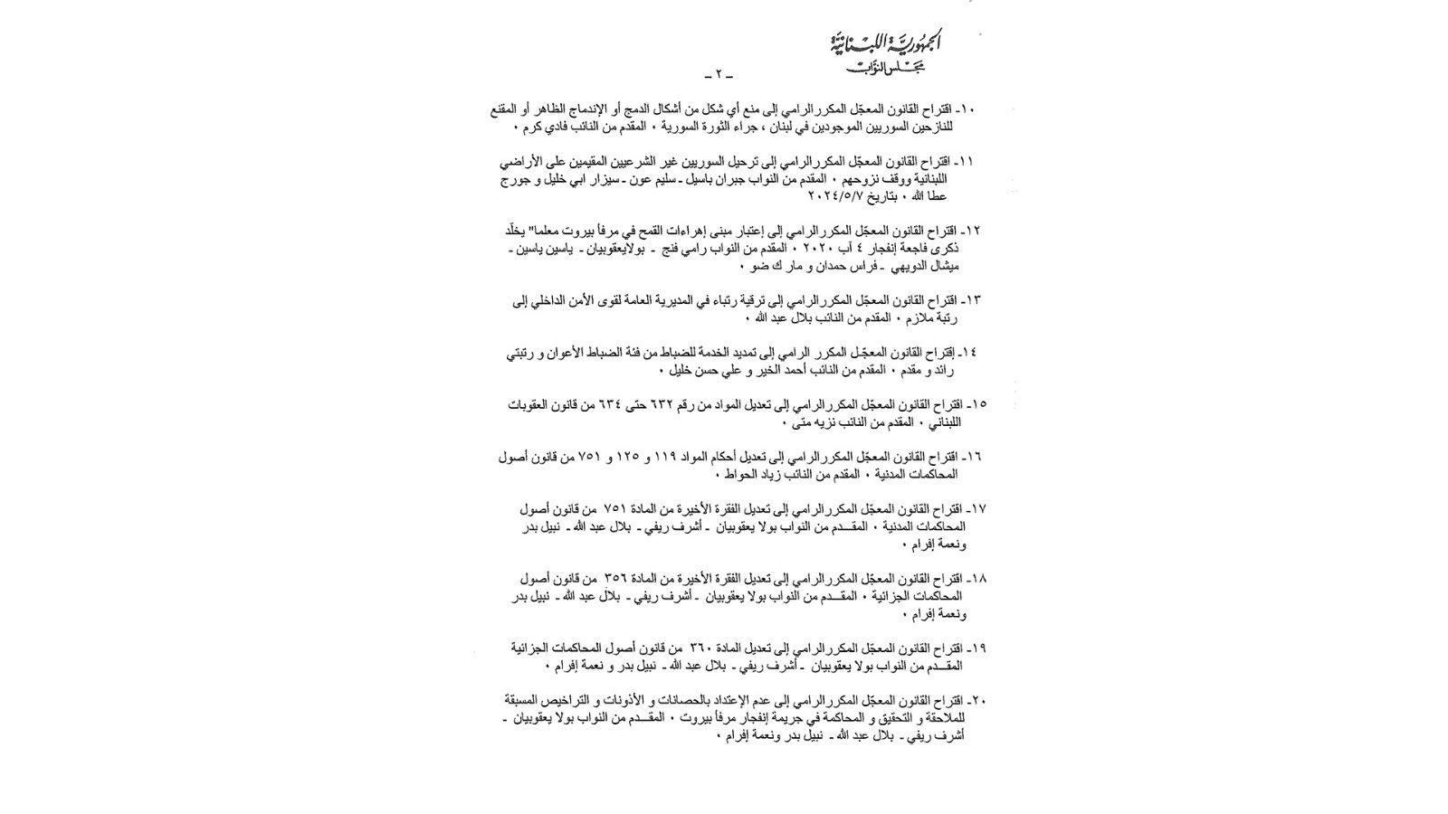 عمّم مجلس النواب جدول أعمال الجلسة الترشيعية، التي دعا إليها رئيس مجلس النواب نبيه بري، عند الحادية عشرة من قبل وبعد ظهر يوم الخميس الواقع فيه 15 أيار 2025.