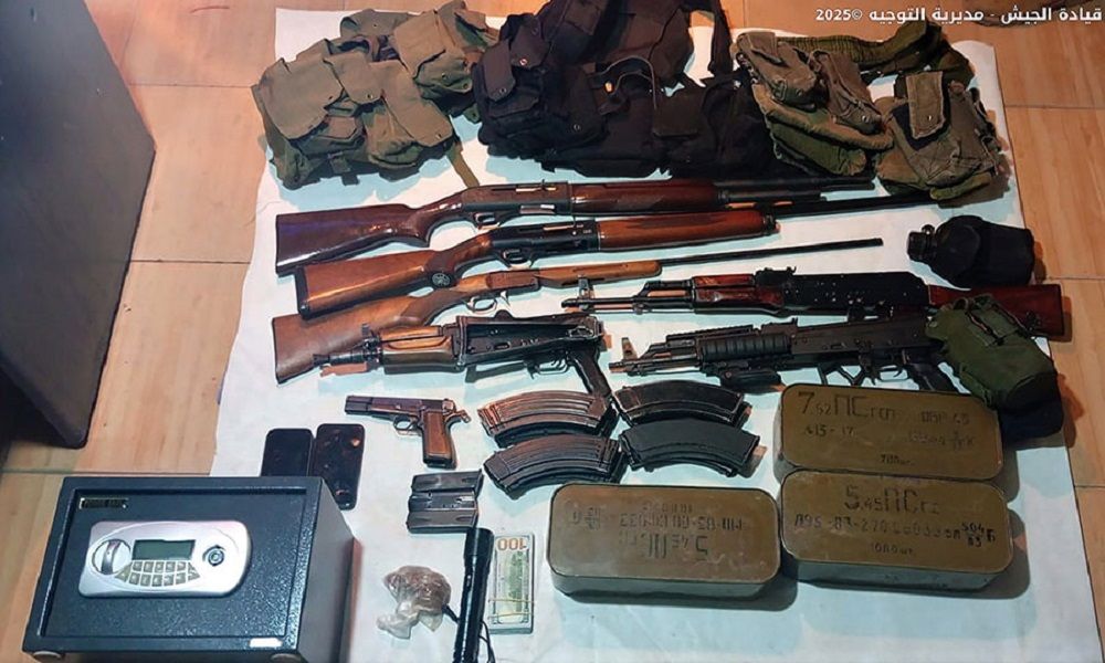 وأضافت: “كما دهمت وحدات من الجيش تؤازر كلًّا منها دورية من مديرية المخابرات منازل مطلوبين في مناطق: جبل البداوي والنبي يوشع – المنية الضنية، مشمش – جبيل، بريتال وعرسال والتوفيقية – بعلبك، عرقة والعوينات – عكار، وأوقفت 8 مواطنين لارتكابهم عدّة جرائم منها الاتجار بالأسلحة وإطلاق النار، وضبطت في حوزتهم كمية من الأسلحة والذخائر الحربية، بالإضافة إلى أعتدة عسكرية. كما نفّذت في منطقة قب الياس – زحلة عمليات دهم لمخيمات النازحين السوريين وأوقفت 19 سوريًّا لتجوّلهم داخل الأراضي اللبنانية بطريقة غير شرعية”.