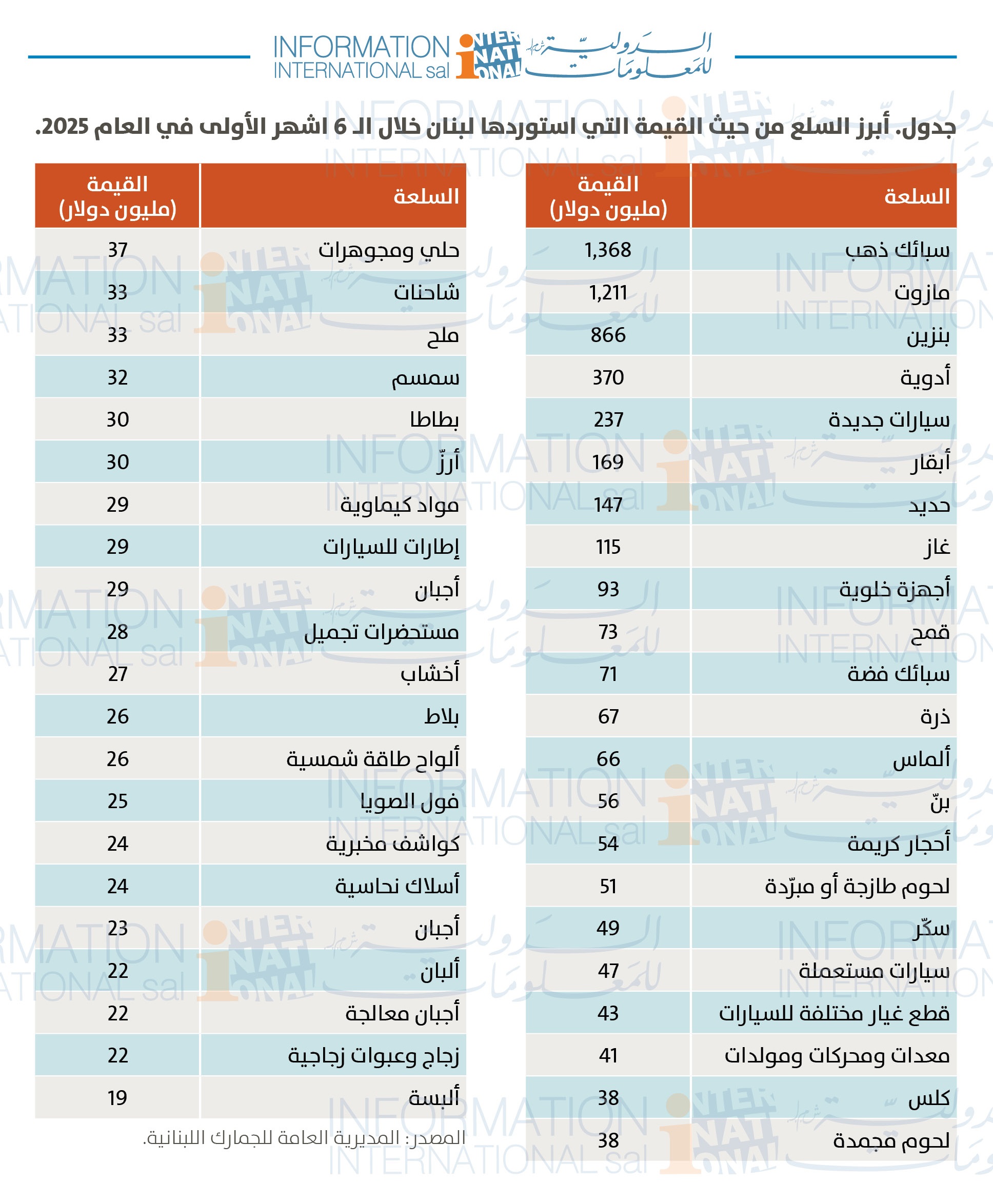 جدول. أبرز السلع من حيث القيمة التي استوردها لبنان خلال الــ 6 اشهر الأولى في العام 2025.