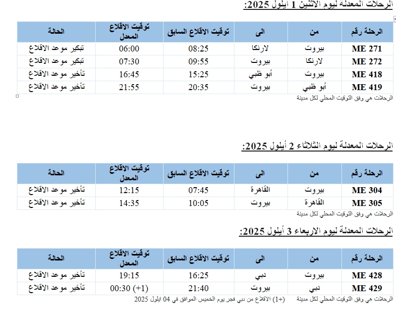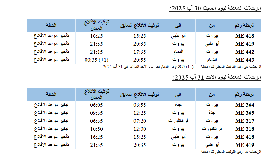 اعلنت شركة طيران الشرق الأوسط أنه ولأسباب تشغيلية، سيتم تعديل جدول مواعيد عدد من رحلاتها من وإلى كل من أبو ظبي، دبي، الدمام، جدة، لارنكا، القاهرة وفرانكفورت للفترة الممتدة من يوم السبت الموافق في 30 آب 2025 ولغاية يوم الاربعاء الموافق في 03 أيلول 2025.