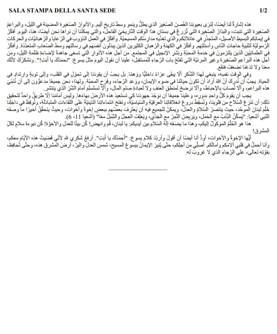 وشدّد الحبر الأعظم على أهمية عدم اليأس، وقال للبنانيين: “انهض وكن علامة للسلام في المشرق”. كما صلّى من أجل أن تظل الأرض اللبنانية مليئة بحب المسيح ومعه نحافظ على الأمل الذي لا ينتهي.