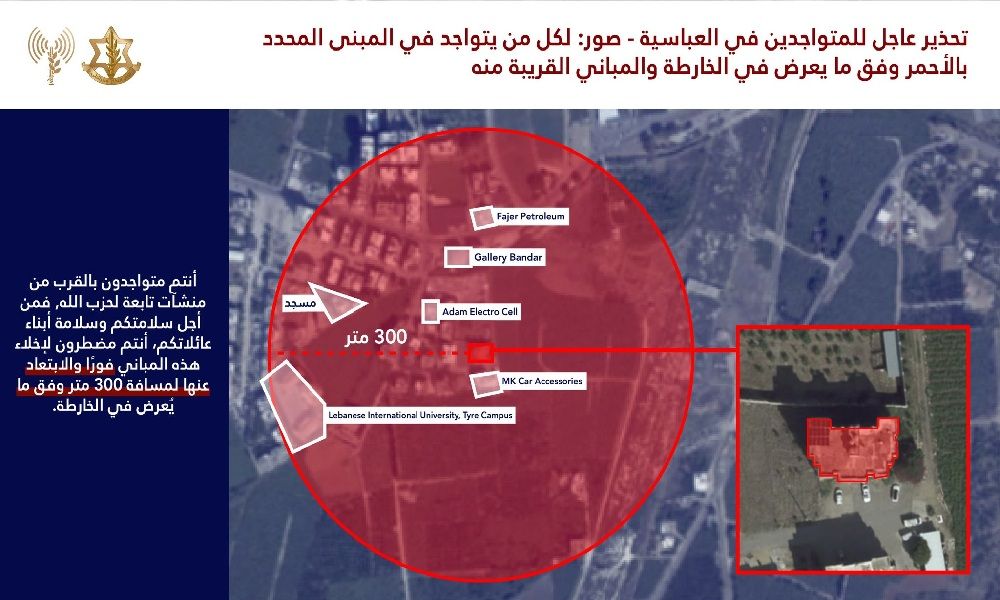 وجّه الجيش الإسرائيلي إنذارًا عاجلًا إلى سكان بلدة العباسية في قضاء صور، معلنًا عزمه تنفيذ هجوم في وقت قريب على ما وصفها ببنى تحتية عسكرية تابعة لـحزب الله.
