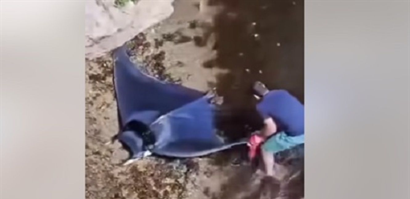 وقام أحد الشباب بإعادتها إلى البحر رغم ثقلها، مستخدماً منشفة.
