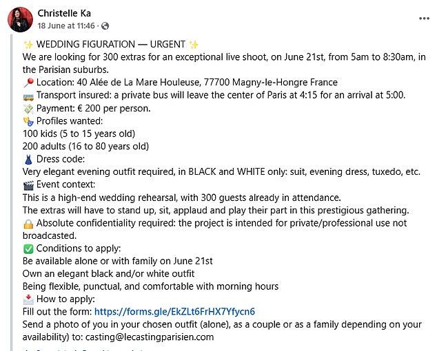 دفع جاكي أكثر من 111 ألف جنيه إسترليني لتأجير الموقع الفاخر وتأمين موسيقيين وكعكة وكراسي تُلائم مئات "الضيوف"، في إطار فعالية وُصفت بأنها "بروفة زفاف راقية". الإعلان المُستخدم للتجنيد ظهر على فيسبوك، عارضًا مكافأة قدرها 200 يورو لكل طفل مع شرط "السرية المطلقة" و"الالتزام بالتصفيق والجلوس وقت الطلب".