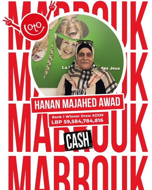 فازت السيّدة حنان مجاهد عوض، بجائزة اللوتو الأولى، في السحب رقم 2239. وبلغت الجائرة التي فازت بها عوض، أكثر من 59 و500 مليون ليرة. Advertisement