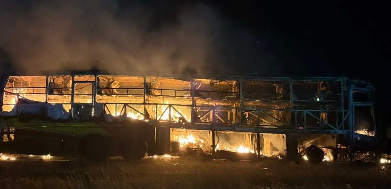 وصدمت دراجة نارية الحافلة من الخلف، ما أدى إلى اندلاع حريق كبير التهم الحافلة خلال دقائق.