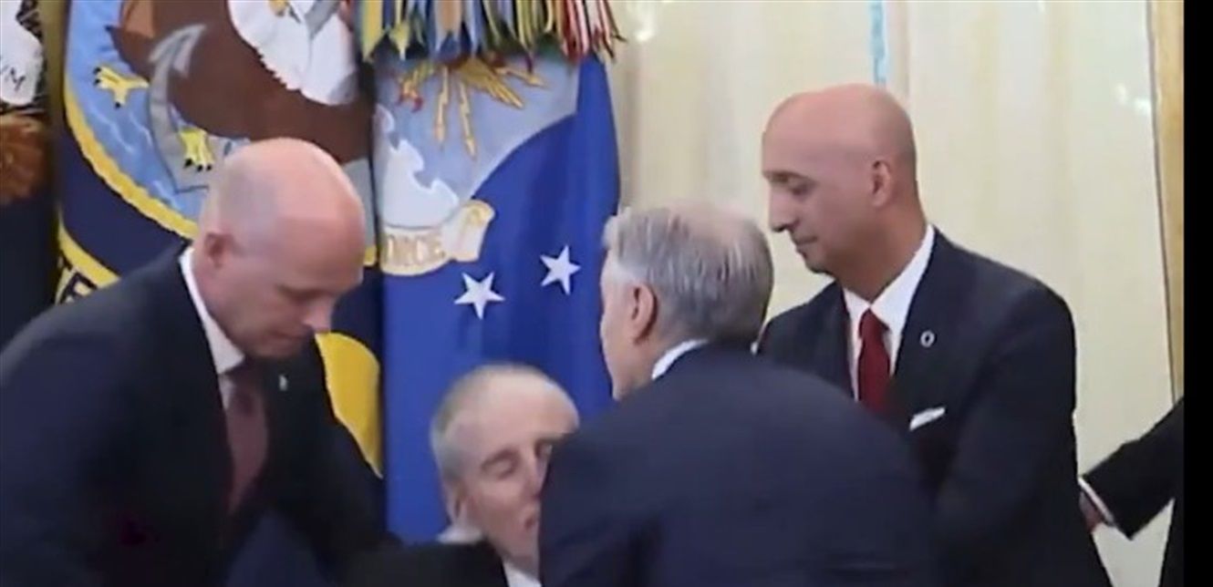 خلال مؤتمر صحفي عقده الرئيس الأميركي دونالد ترامب في البيت الأبيض سقط رجل كان يقف خلف الرئيس بين مدراء شركات الأدوية أمام الكاميرات مغشيا عليه.