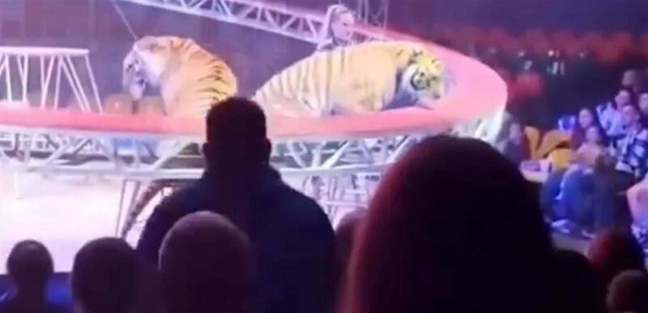 وبدأ المشهد، الذي انتشر على نطاق واسع عبر الإنترنت، بعرض 3 نمور تقف على كراسٍ، بينما تتجول المروضة ومساعدها على خشبة المسرح، وتفصلهم عن الجمهور شبكة دائرية.