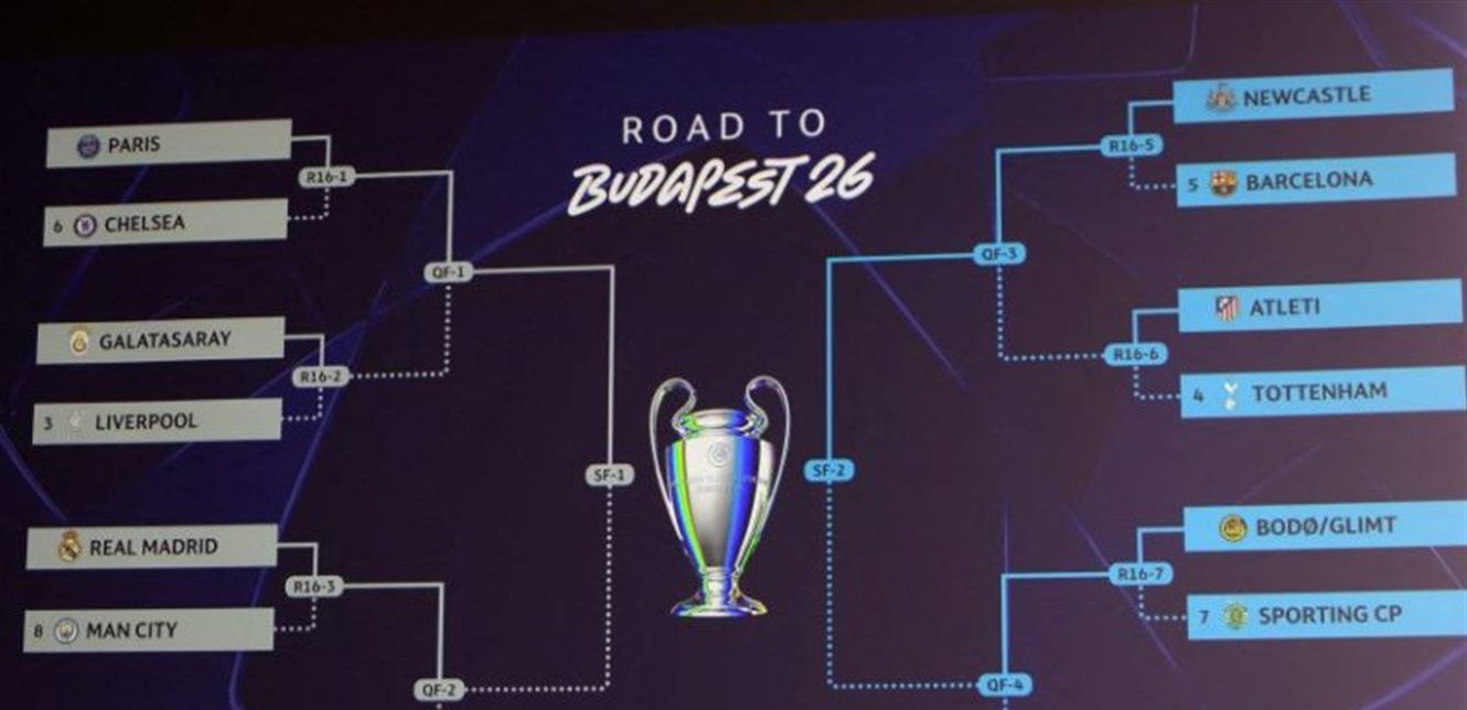 أما أرسنال، متصدر مرحلة الدوري، فسيتقابل مع باير ليفركوزن، بينما يلعب بايرن ميونيخ، الذي حل ثانيا أمام أتلانتا. وسيصطدم نيوكاسل يونايتد ببرشلونة، فيما يلتقي ليفربول مع غلطة سراي التركي.