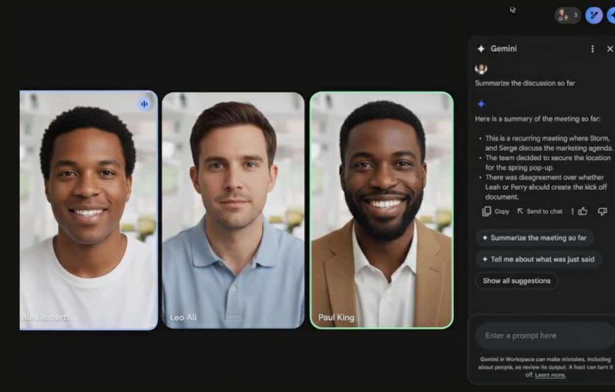 وحذّرت الشركة من أن المساعد الذكي Gemini قد يخطئ، مما يعني أن المستخدمين بحاجة إلى مراجعة المخرجات وعدم الاعتماد عليها بنحو كامل، خاصةً عند متابعة أجزاء مهمة من الاجتماعات.