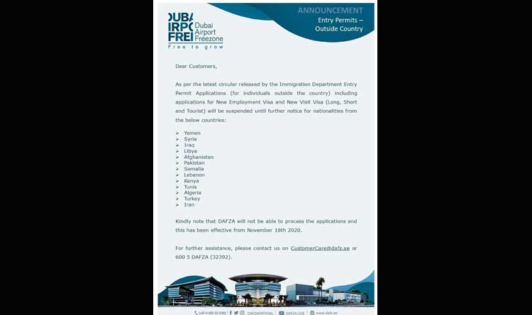 أصدرت شركة دبي سوق الحرة، اليوم الاثنين، وثيقة رسمية تمنع من خلالها مواطني دول لبنان واليمن وسوريا والعراق وليبيا وافغانستان وباكستان والصومال وكينيا وتونس والجزائر وتركيا وايران من دخول أراضيها.