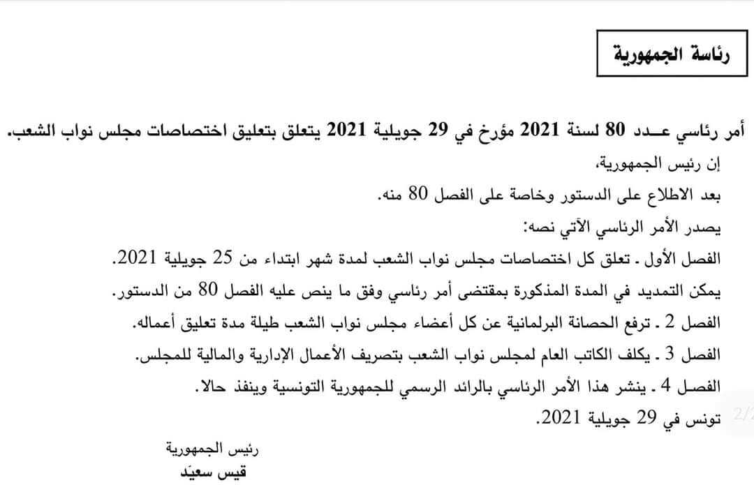 نشرت الجريدة الرسمية التونسية الأمر الرئاسي رقم 80 الصادر، مساء يوم أمس الخميس، الموافق للـ29 من تموز والقاضي “بتعليق كل اختصاصات مجلس نواب الشعب لمدة شهر ابتداء من 25 تموز 2021.