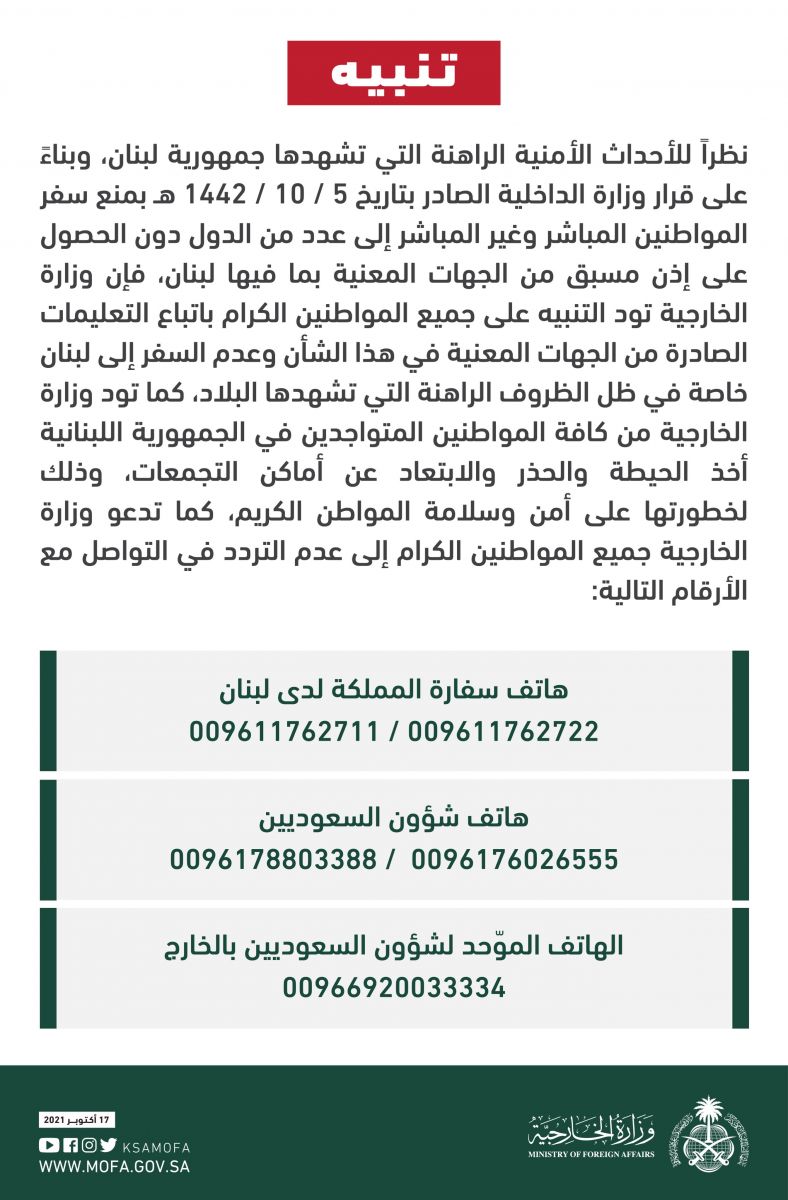 وأضافت، “نظراً للظروف الراهنة في #لبنان ندعو جميع المواطنين الكرام إلى اتباع التعليمات الصادرة من الجهات المعنية بعدم السفر إلى العديد من الدول ومنها لبنان، كما ندعو الجميع إلى عدم التردد في التواصل معنا عبر الأرقام التالية”: