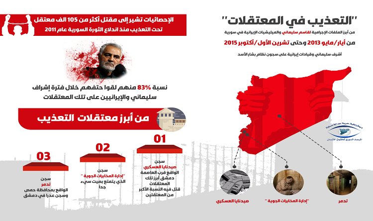 أشار المرصد السوري لحقوق الإنسان الى أنه “من ضمن أكثر من 105 معتقلين قتلوا تحت التعذيب في سجون النظام السوري، نسبة 83% منهم قضوا خلال فترة إشراف قائد فيلق القدس قاسم سليماني والإيرانيين على المعتقلات بين عامي 2013 و2015”.