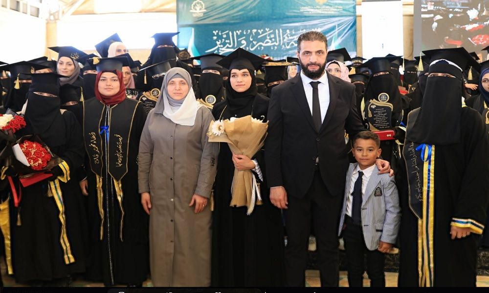 وظهر الشرع في الحفل يكرم الطلبة الخريجين ومن بينهم زوجته لطيفة، حيث جمعتهم على منصة التكريم صورة تذكارية.