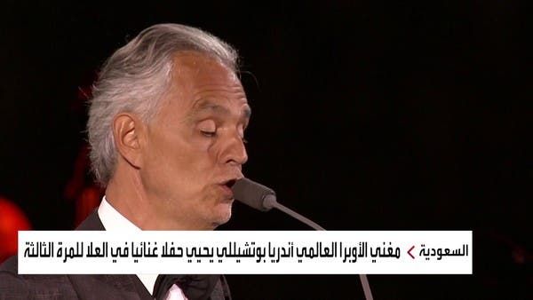 أحيا مغني الأوبرا الإيطالي العالمي آندريا بوتشيلي، أمس الخميس، حفلاً غنائياً في العلا (شمال غربي السعودية) للمرة الثالثة.