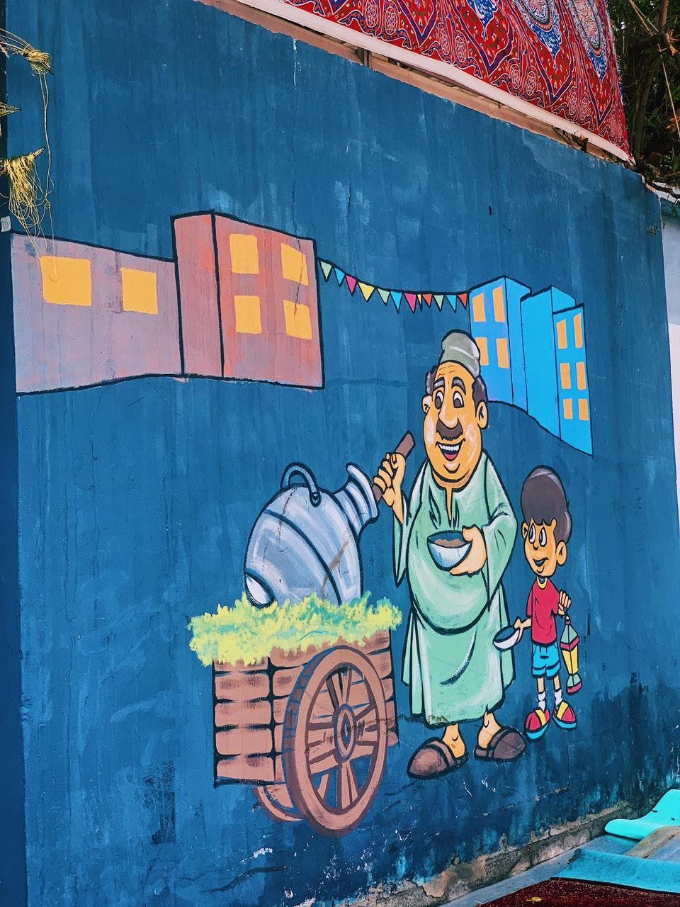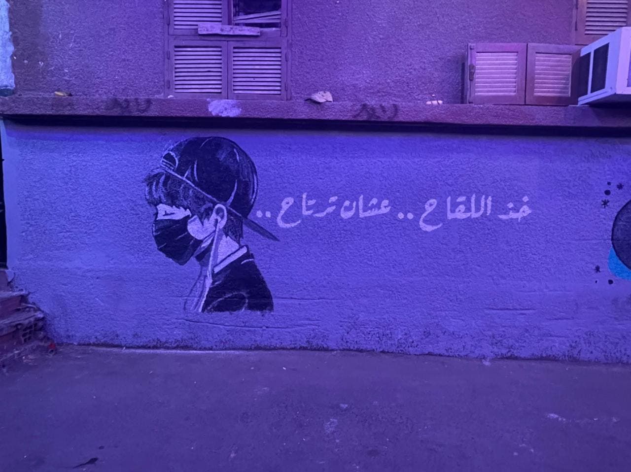 وقال تضمنت الجداريات رسومات لفوانيس رمضان وهلال رمضان، بالإضافة إلى الدراجة النارية لجيل الطيبين وعربة الفول، كما اشتملت هذه الجداريات على عدة عبارات منها "خذ اللقاح عشان ترتاح" و "رمضان يجمعنا" و" سنة عدت .. وجمعنا ردت" وغيرها من العبارات.