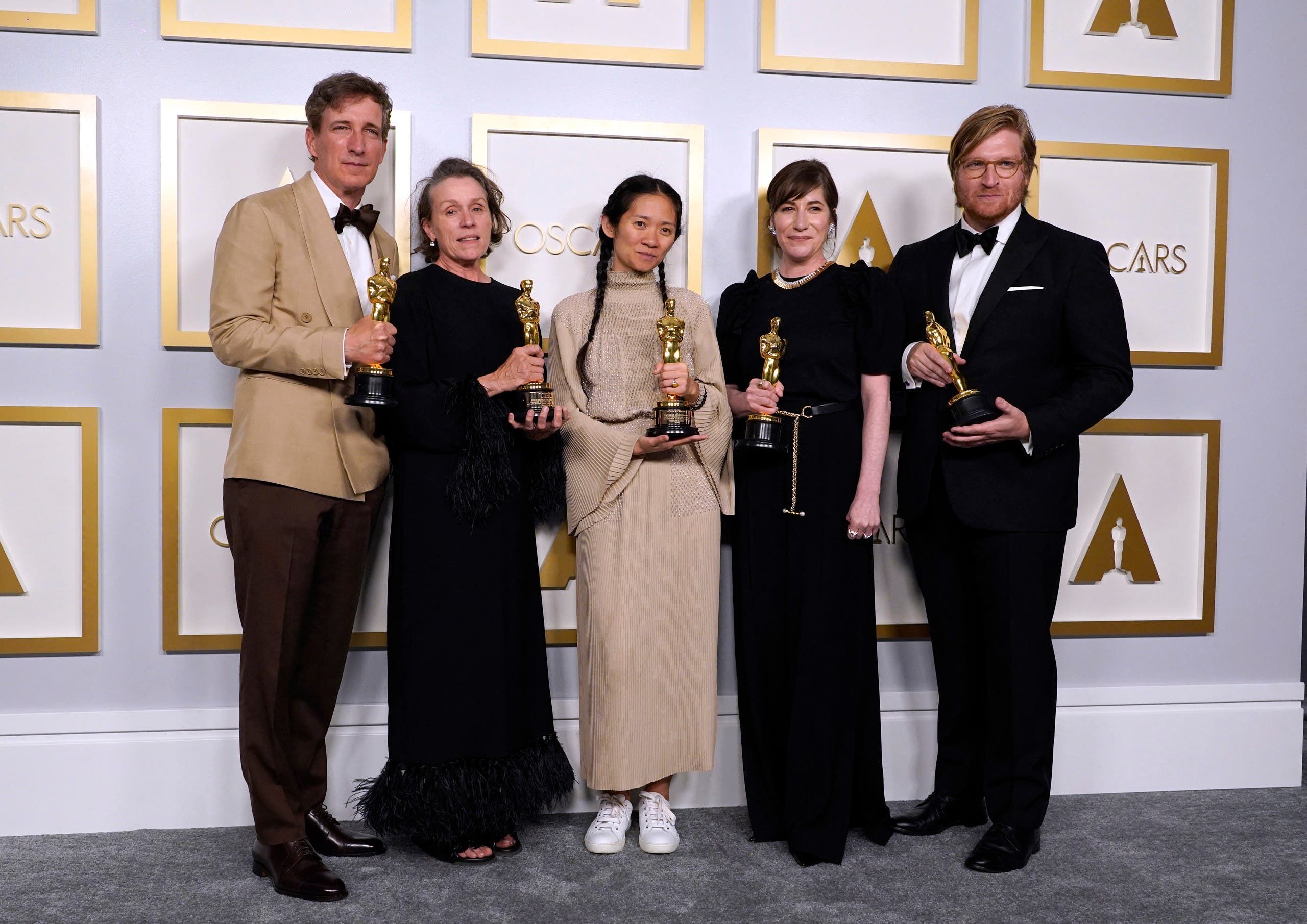 من اليسار.. المنتجون بيتر سبيرز ، فرانسيس مكدورماند ، كلوي تشاو ، مولي آشر ودان جانفي ، في حفل توزيع جوائز الأوسكار في لوس أنجلوس