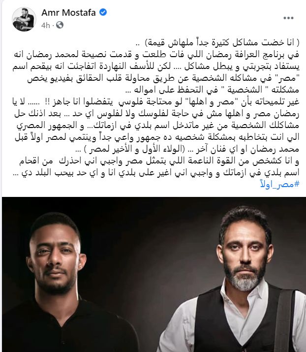 وشن المطرب والملحن عمرو مصطفى هجوما كبيرا على رمضان، وحذره من إقحام اسم مصر في أزماته الشخصية، معتبرا أن الجمهور الذي يخاطبه رمضان جمهور واعي.