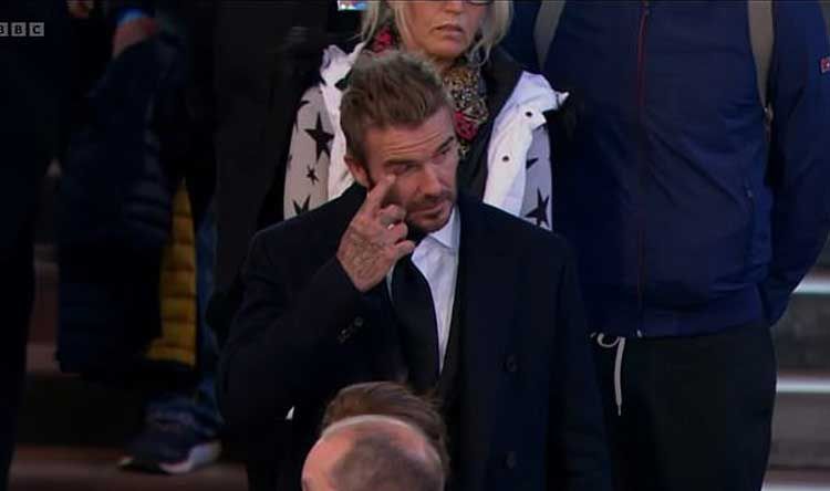 بعد أن ظل واقفاً لساعات في الصف لإلقاء الوداع الأخير للملكة إليزابيث، رصد موقع Daily Mail، مقطع فيديو لنجم كرة القدم السابق ديفيد بيكهام وهو يمسح دموع عينه بينما يقترب من نعش الملكة بعد انتظار دام 13 ساعة يوم الجمعة، إذ اعترف أمام كاميرات التلفزيون، وقال، “اعتقدت أنه سيكون أكثر هدوءً في الساعة الثانية صباحاً … كنت مخطئاً!”