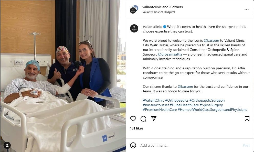 ونشر حساب المستشفى صورة لباسم يوسف وهو يرقد مبتسماً على سرير في المستشفى، ويده موصولة بالمحاليل الطبية، موجّهاً الشكر الى الإعلامي المصري على اختياره المستشفى وثقته التامة بالطاقم الطبي العامل فيها.