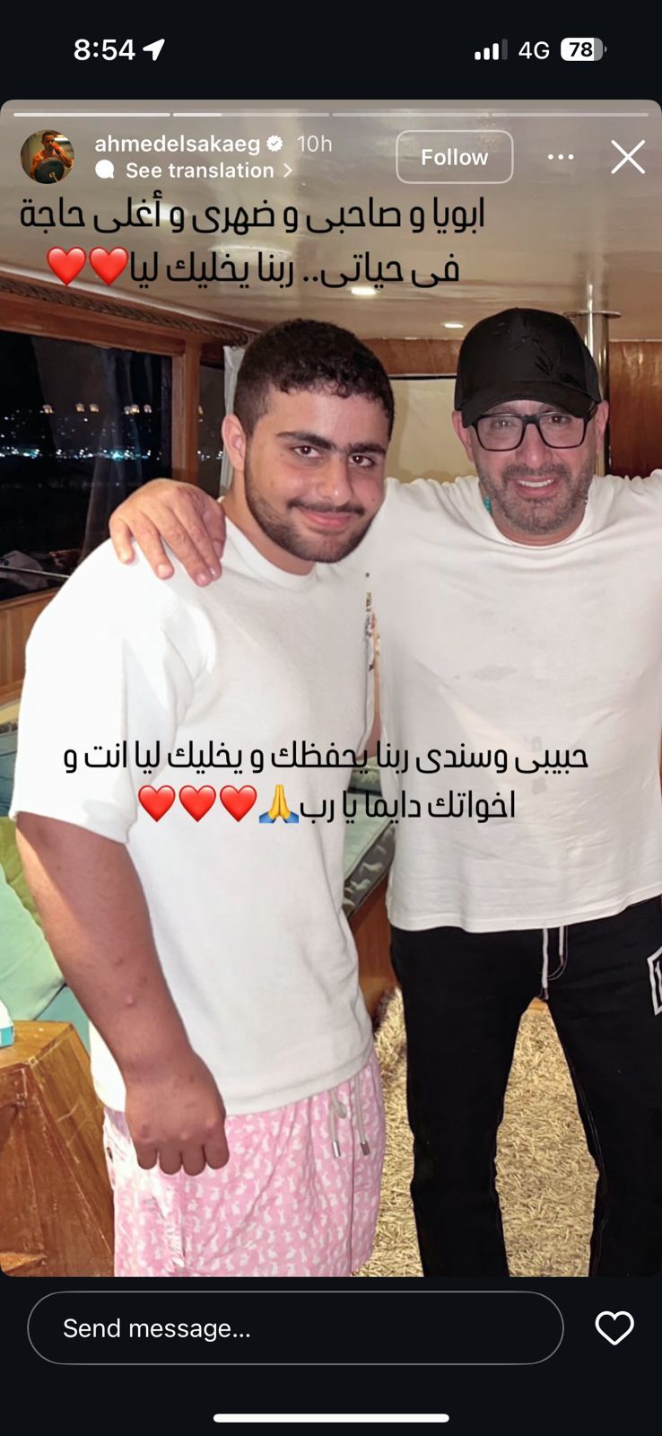 ليرد عليه الفنان أحمد السقا قائلاً: "حبيبي وسندي، ربنا يحفظك ويخليك ليا إنت وأخواتك دايمًا يارب."