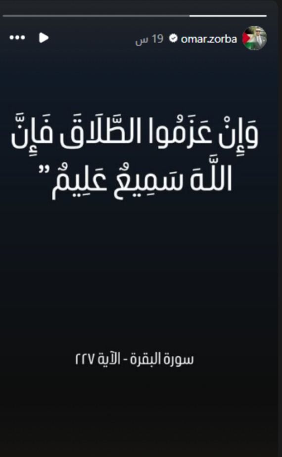 وشارك عمر زوربا عبر خاصية "الستوري" في منصة "إنستغرام" منشورًا يتضمن الآية القرآنية "وإن عزموا الطلاق فإن الله سميع عليم"، دون أن يرفقها بأي تصريح أو تعليق يؤكدان خبر طلاقه رسميًا.