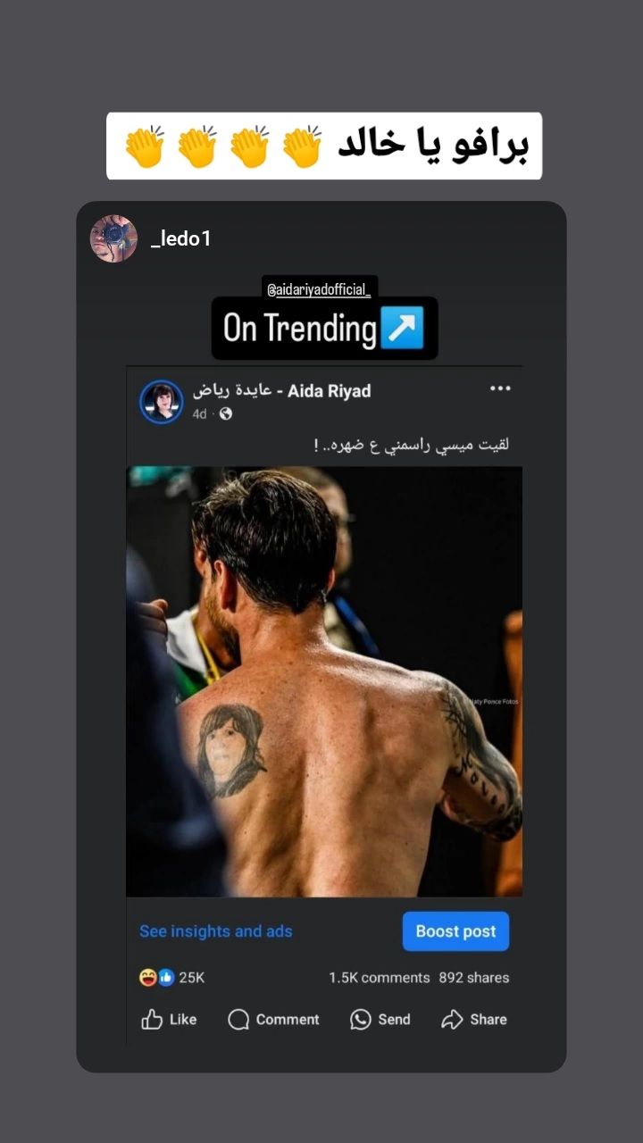 واختارت عايدة رياض التعليق على الصورة بأسلوب ساخر عبر حسابها الرسمي على "إنستغرام"، فكتبت: "وجدت ميسي وقد رسمني على ظهره!"، وهي العبارة التي فتحت الباب أمام موجة من التفاعلات والتعليقات بين محبيها ومحبي اللاعب العالمي.