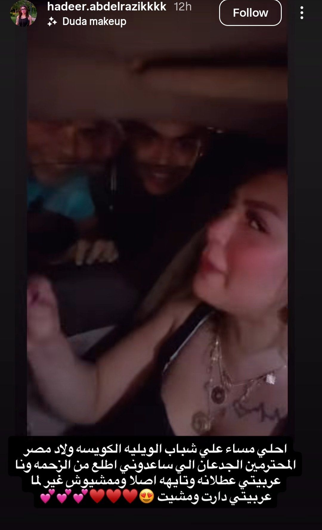 وشاركت أخيراً مقطع فيديو ظهرت فيه بداخل سيارتها ومحاطة بمجموعة من الشبان، وحرصت على توجيه التحية لهم بعد مساعدتها على تخطي الزحمة، وعلى تشغيل سيارتها المعطلة من جديد، موجهة من خلال الفيديو تحية للشباب المصري الشهم.