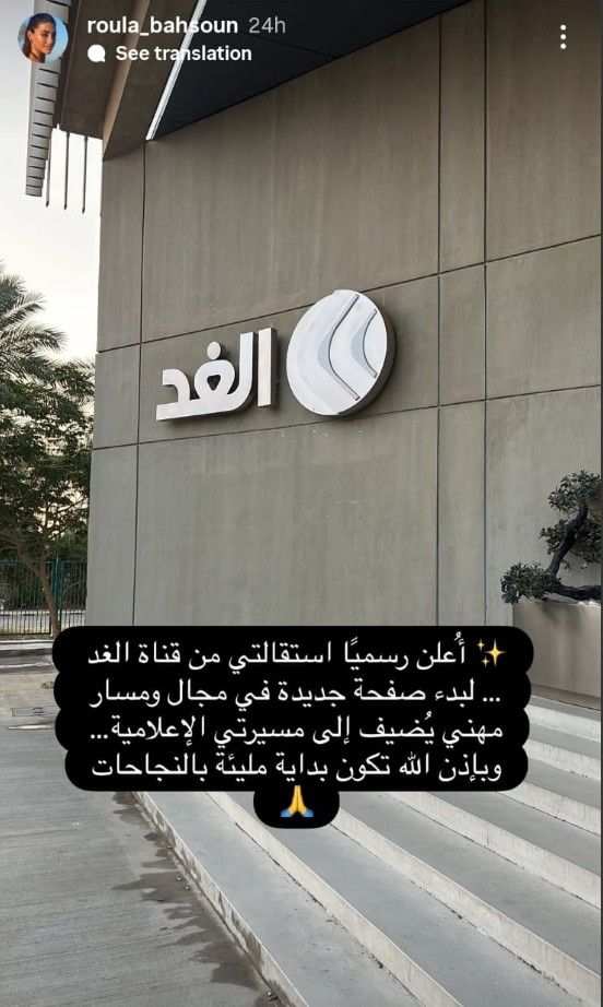 أعلنت الإعلامية رولا بحسون استقالتها من قناة الغد عبر منشور على حسابها على انستغرام.