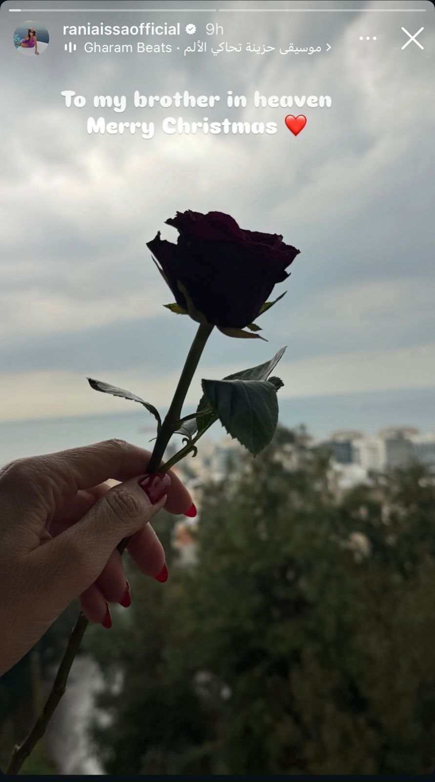 "To my brother in heaven, Merry Christmas" مع رمز قلب أحمر، مرفقة بصورة ليد تحمل وردة في خلفية غائمة، تعكس مشاعر الحزن والاشتياق.