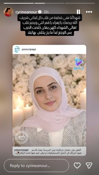 بعد العثور على جثمان الشهيدة زهراء قاسم في عين المريسة في بيروت، جراء الغارة الإسرائيليّة التي استهدفت المنطقة في 8 نيسان، قالت الفنان سيرين عبد النور: "شهداؤنا هني قطعة من قلب كل لبناني شريف".